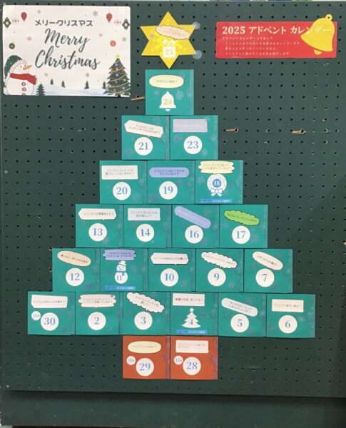 児童図書室にあるアドベントカレンダーは日にちの書かれた扉をめくると、中にクリスマスに読みたくなる本を紹介しています。