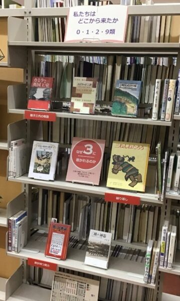 現在の展示は、今年度の2回目(11月~2月)です。 “私たちはどこから来たのか”(0・1・2・9類)ゾーンでは、「なぜ「3」に惹かれるのか」というテーマでブック・スプラウトの展示を行っています。