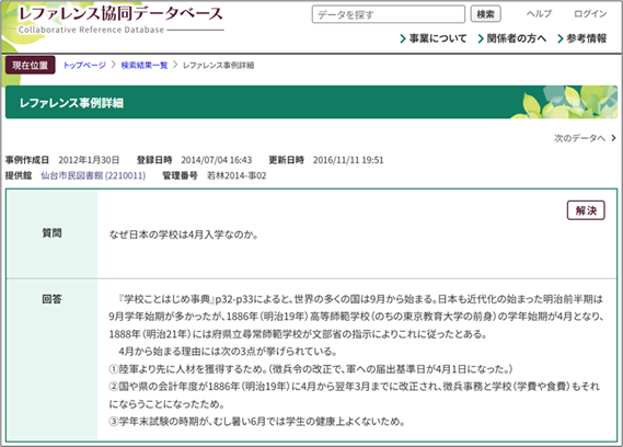 例えば、「なぜ日本の学校は4月入学なのか」、という疑問があったとき、このデータベースで「4月入学」とかいうキーワードで検索してみると、そのものずばりの事例が出てきました。仙台市民図書館が、実際に受けたレファレンスの事例です。