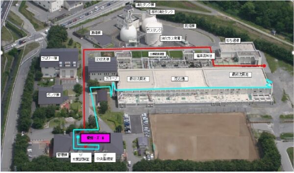 ④ 水処理棟で下水がきれいなるまでの水処理の流れを見学→