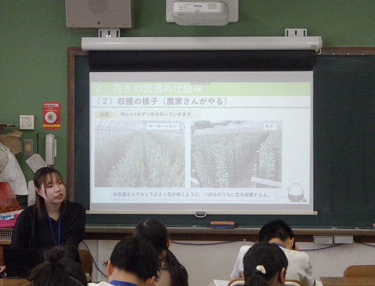まずは出前授業です。講師のJA全農長野の依田様から「花きの流通の仕組み・活用」について教わりました。