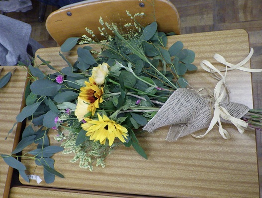 使用した花材は、ヒマワリ、バラ、スターチス、千日紅、ユーカリ、スモークグラス、ユーカリです。ヒマワリやスターチスは松本管内でも栽培が盛んです。