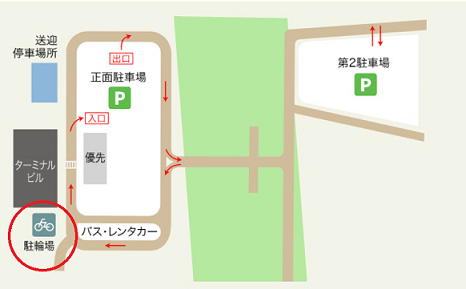右手建物はターミナルビル。駐輪場から10秒でチェックインできます。