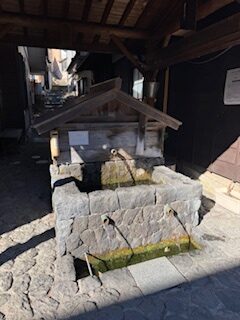 木造の屋根と石積みに囲まれた水場には、今も澄んだ水が流れています。かつて旅人がのどを潤したり、住民の生活用水として使われたりした場所のようで、柄杓が並ぶ様子からも、大切に守られてきたことが伝わってきました。静かな冬の日差しの中で、水面だけがきらきらと揺れている光景が印象的でした。だいぶ歩いて、喉も乾いたところでしたが、飲むことはできません。