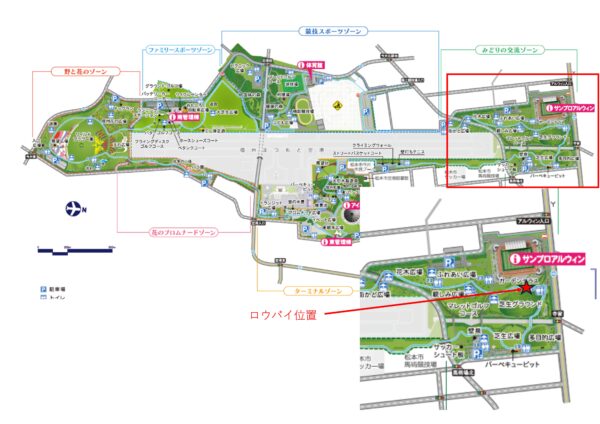 場所はみどりの交流ゾーンにあるサンプロアルウィン東側・芝生グラウンドの近くにあります。