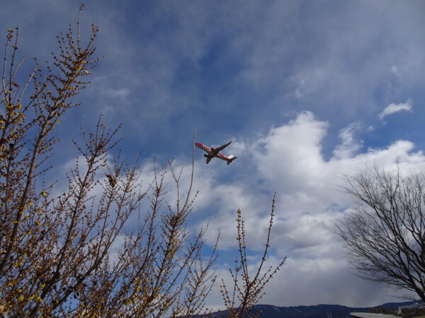 ロウバイの場所は滑走路に近いので、花と飛行機との共演を見ることもできます。