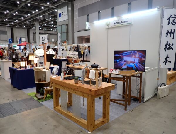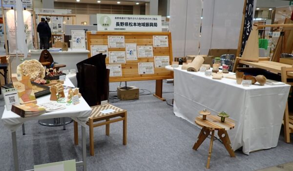今年は、39都道府県から約320事業者が出展し、長野県内から32ブース・26事業者(全国最多)が出展し、そのうち松本地域からは、11事業者の出展と、8事業者の製品展示を行いました。キッチンカウンターや家具、照明といった比較的大きな木製品の他、精油やオーナメントといった小さなものまで、長野県産の木材を用いた様々な木製品がブースに並び、大変にぎやかでした。