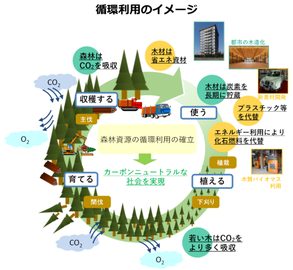 「植える→育てる→伐る→使う」森林循環(下の図)を目指して、木材を木造建築や、床や壁等の木質化、家具や木製品として「身近な場所でもっと使われるようにしよう、様々な用途で使おう」という意気込みを持った事業者の皆さんが展示(一部販売)と商談を行う国内最大級のイベントです。