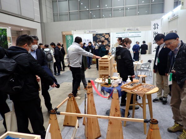 出展者のみなさんは、ブースに来られた方へ製品カタログやチラシを来場者に渡して製品の特徴やコンセプトの説明をしながら、手に取って質感などを確認してもらい、販売促進につなげていました。製品そのものの良さはもちろんのこと、使用した材(木)が育った自然環境や、建築で規格外となったような材の有効活用をしている出展者の思いを説明することにより、木製品への理解を深めてもらえるよう皆さん熱が入った説明をされていました。