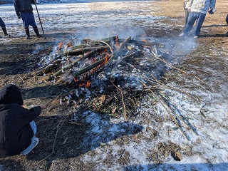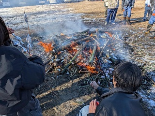 子供たちや保護者、育成会、地元消防団、地域の皆様が見守る中、火がつけられました。