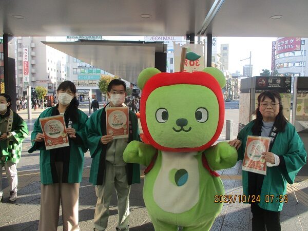 宴会時に料理を食べ残さないこと、また家庭において賞味期限切れによる食品廃棄を減らすことを呼びかける「残さず食べよう!30・10運動」の街頭啓発を、10月24日(金)に松本市と連携してJR松本駅お城口にて実施しました。