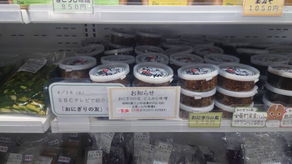 この「おにぎりの友」が4月にSBCテレビで紹介され人気となり、黄こしょうの在庫不足も重なり品薄状態に…… 今まで買えない時はなかったのに、購入するまでに3回もお店に足を運びました。実は今回もショーケースは空っぽ