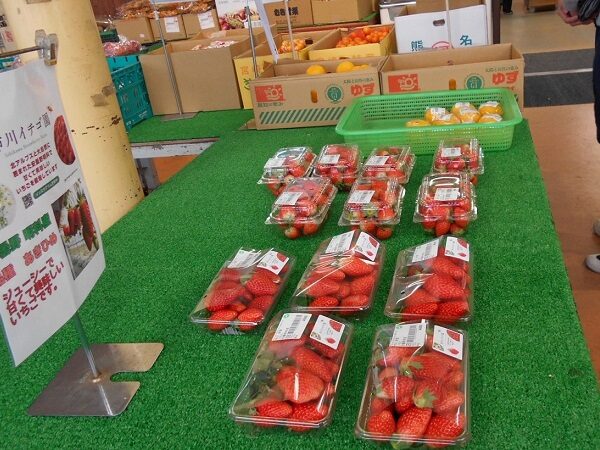 地元産イチゴが大人気!出来が良く昨シーズンより一月ほど早い出荷になりました。去年は夏日が続いたためカキの数は少なかったですが、生産者手作りの干し柿が出ています。地元のワイナリーで作ったワインや、「秋映」「シナノゴールド」を使ったJA松本ハイランドのリンゴジュースも販売しています。
