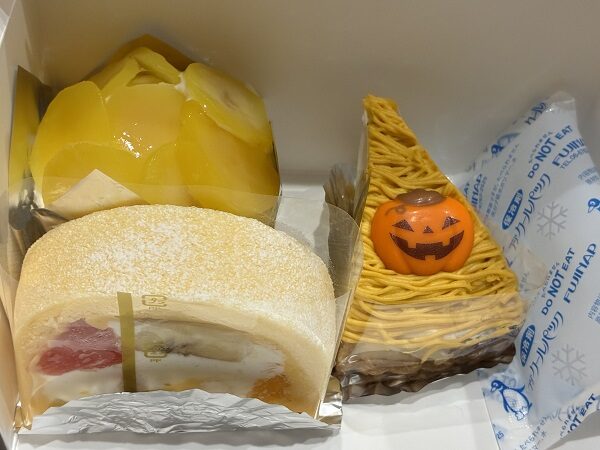 左奥 マロンケーキ ¥600、左手前 スフレロール ¥470、右 かぼちゃのたると ¥550