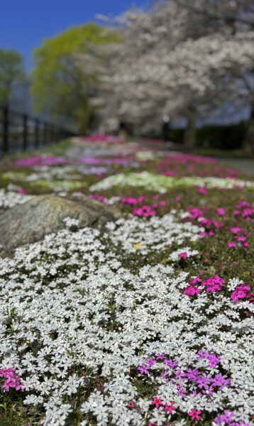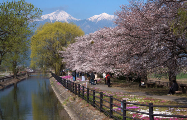 桜と冠雪の常念岳、シバザクラという春の要素が詰め込まれた人気スポット。