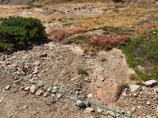 ※登山道(緑ロープ)の外に土が流れ出てしまい、植物の生育場所を圧迫しています
