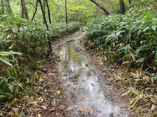 始めは50㎝程度だった道幅が徐々に広がって1.0m以上になることや、降雨時に大きな水溜りになってしまう事。