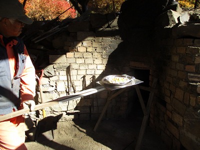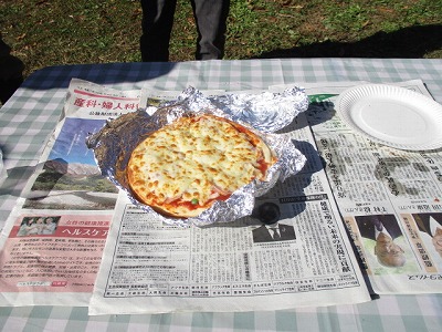 会場が盛り上がったのは続いて行われた「ピザ焼き」です。火を止めてからしばらく経っているのに、窯の温度を測ってみると300℃以上です。参加者で調理したピザを、これもまた柄の長いアルミ製の台に乗せて炭窯に入れます。3分~5分くらいでしっかり焼けたピザが完成しました。熱々のピザを切り分けて参加者全員でいただきました。(とても美味しかったです)