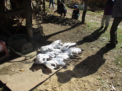 こうした体験ができたのも「一期会」のメンバーの皆様のお陰です。代表の古田氏にお聞きすると、ずいぶん前から炭材(炭窯に入れる材料)づくりをされていたとのこと。炭材は炭窯の周りの森林の整備によって伐り出された広葉樹材で、太い材は割って作ったそうです。また体験日の6日前から炭窯を温めて、5日前に炭材を炭窯内に立て込みをして、4日前に本格的に火を入れ、火の番をかかさず行ったとのことでした。古田氏は、「森林整備を行い、その材を利用することで、地面がすっきりし見通しがよくなり、クマも出にくくなる」とおっしゃっていました。