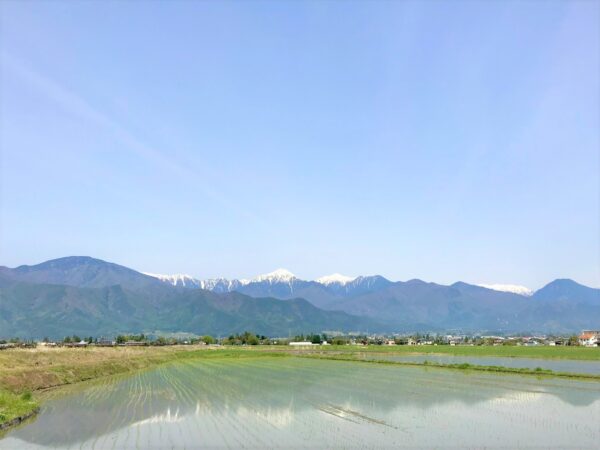 水田に残雪の北アルプスが映り、とても美しいです。