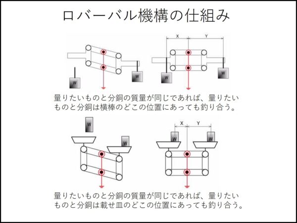 (計量物を皿のどこにおいても正確な計量ができるという、上皿天秤の原理となる仕組み)