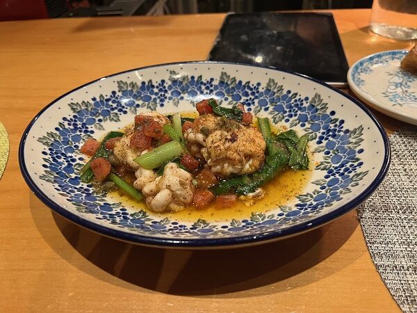 さておき、付け合わせの野菜は地物。焼きナスのソースが甘くて実にうまい。