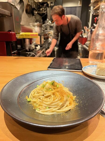 カラスミスパゲッティ。青いのは確かカブ。しょっぱくてうまい。