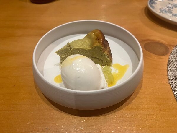 ピスタチオのバスクチーズケーキにヨーグルト風味のジェラートで締め。ソースはシャインマスカット。