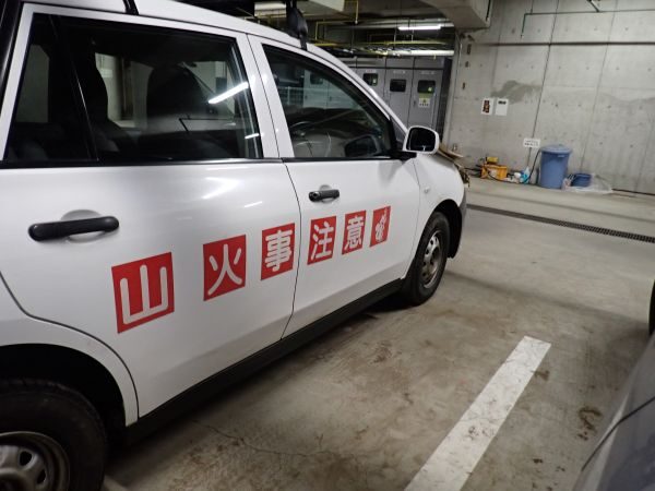 ・駅、市役所、学校や登山口などに写真1のようなのぼり旗を掲示するほか、テレビ、ラジオ、インターネット等の各種広報媒体や以下の写真2のような公用車で、パトロールを行いつつ、備え付けのスピーカーから山火事予防の啓発音声を流すことを通じて地域住民や入山者等に対し、山火事予防意識の高揚を図る