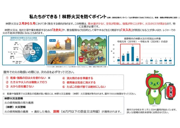 全国での大規模な山火事を受けて、長野県林務部では毎年3月1日から実施している山火事予防運動を1ヵ月早めて2月1日から実施しております。