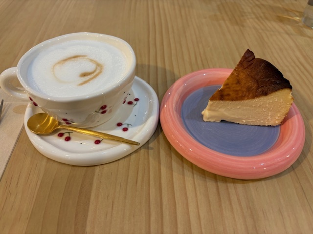 私はホットカフェラテと、天使のバスクチーズケーキを注文しました。