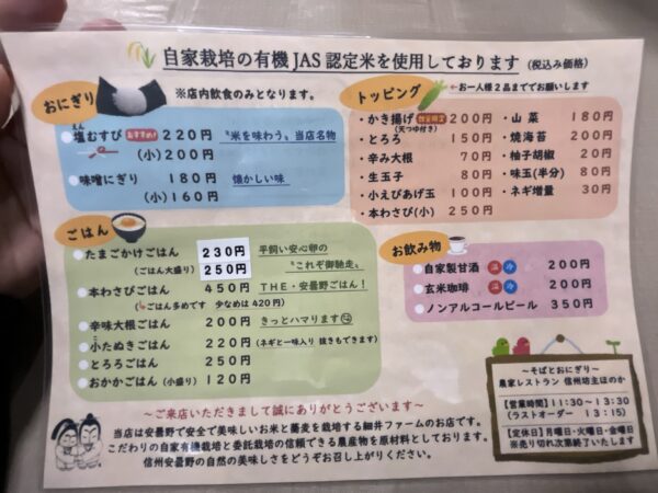 ぜひ安曇野市へ行かれる際には有機栽培されたそばやお米をリーズナブルな価格で味わえる