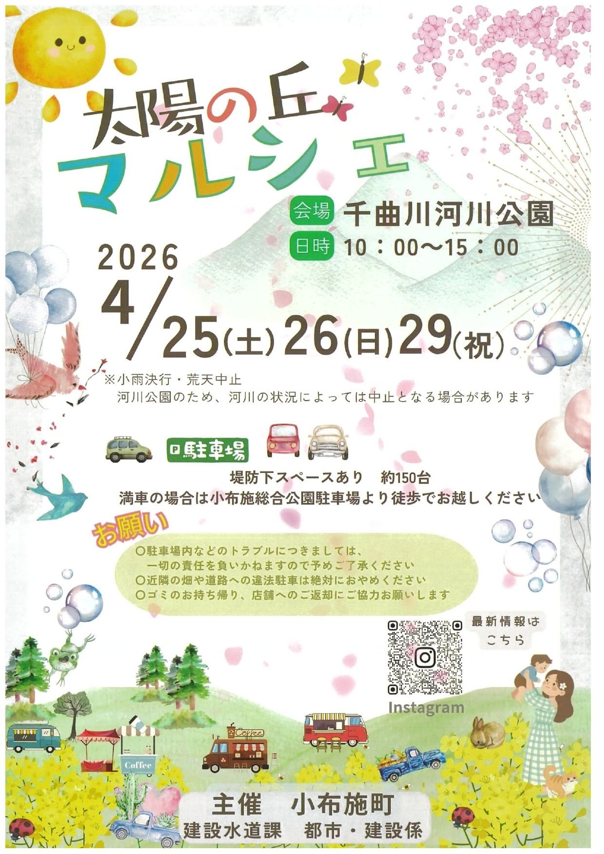 こんにちは!小布施町産業振興課のKです。 すっかり暖かくなり、春爛漫の陽気ですね。 県内の桜スポットは続々満開…を過ぎ、すでに葉桜になりつつといったところですね。 毎年恒例ではありますが、小布施のお花見スポット、千曲川河 … 続きを読む 【小布施町】小布施でお花見!桜と菜の花の共演をお楽しみください。4月25土、26日、29祝は『太陽の丘マルシェ』を開催!