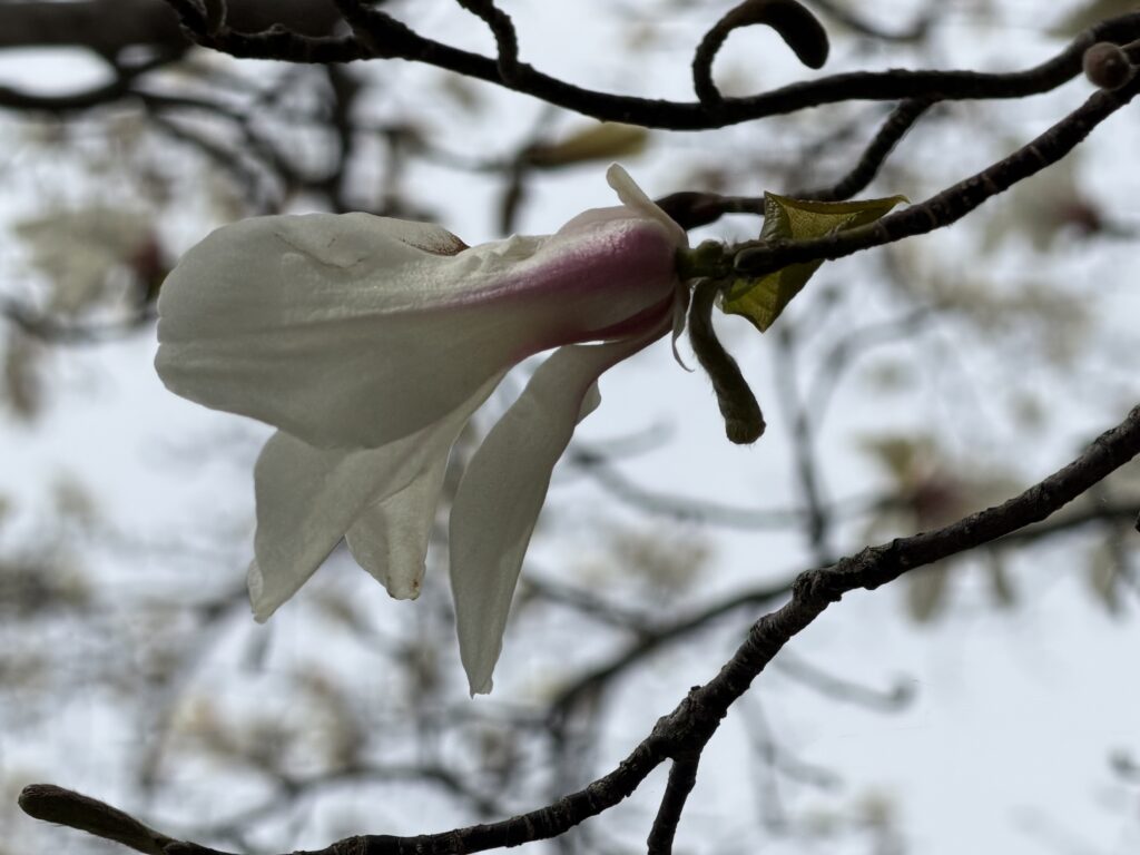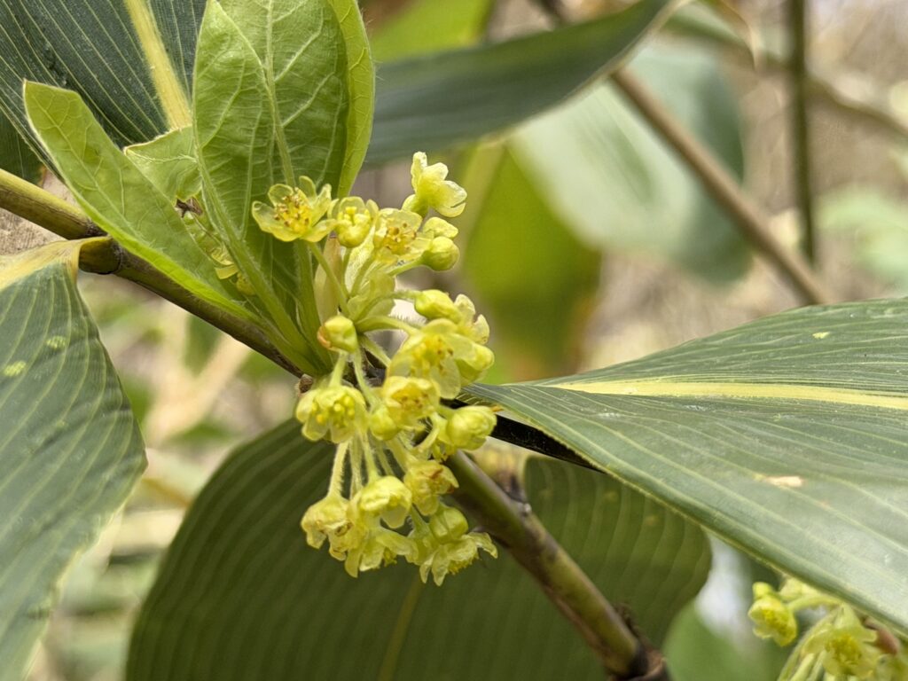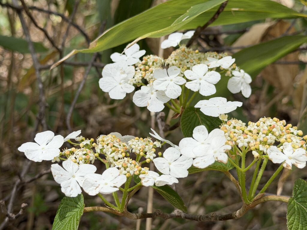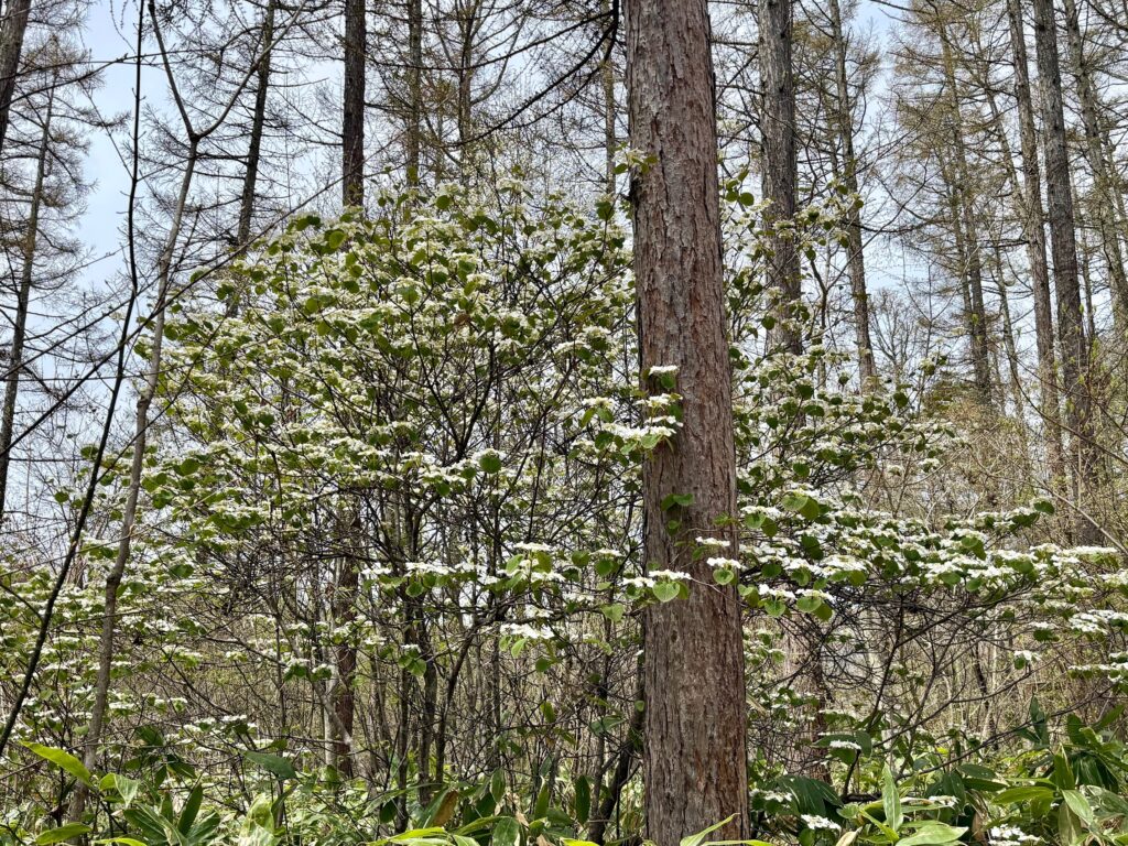 大座法師池やすぐ横にある小天狗の森を歩くと、オオカメノキやクロモジ、コブシなどの花にも出会えます。