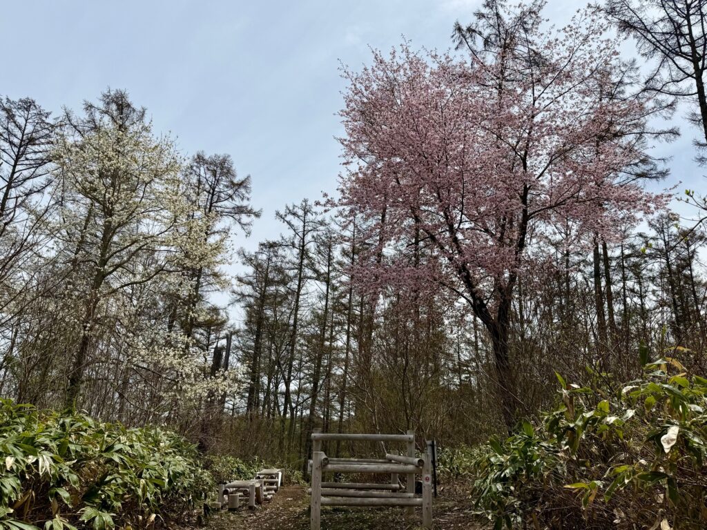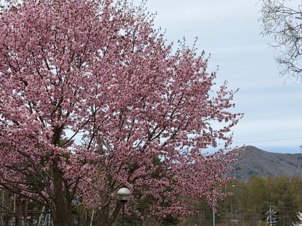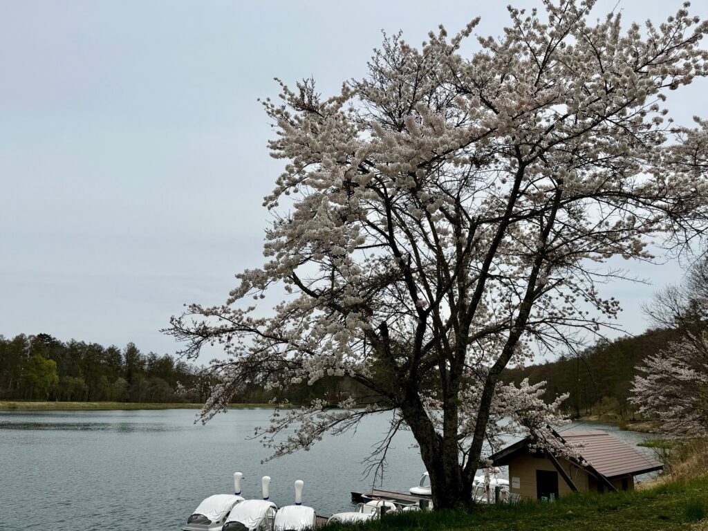 飯綱高原、大座法師池周辺では桜が満開になっています。