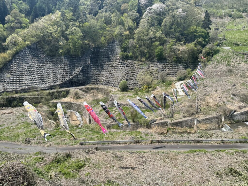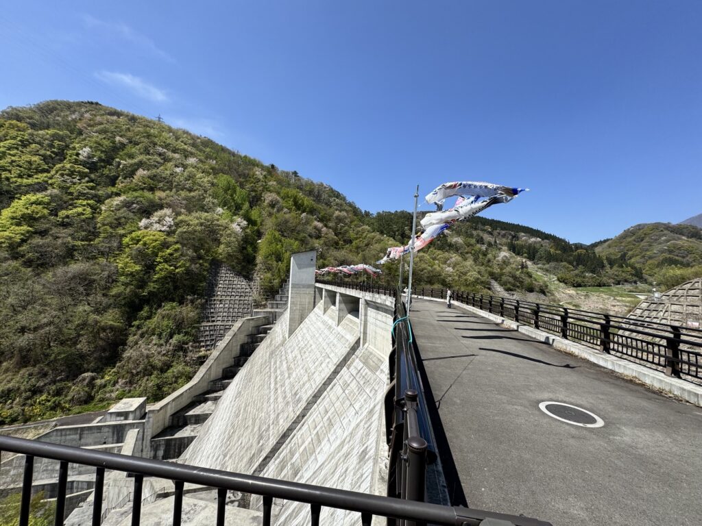 ダムの天端には、54匹の鯉が優雅に泳いでいます。また、ダムの上は、吹き抜ける風がダムの壁にあたり、吹き上がりますので、他の鯉のぼりとは一味違う泳ぎ方をします(下の写真)。
