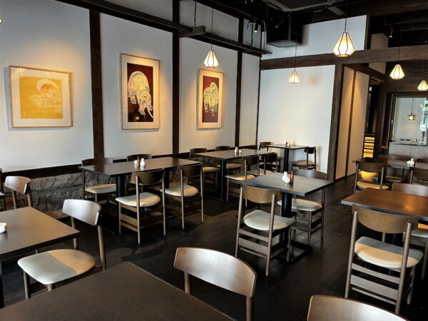 内部は約230平米、計95席と広々。店内にある絵画や工芸品の多くは、長野県にゆかりのある作家さんのものです。