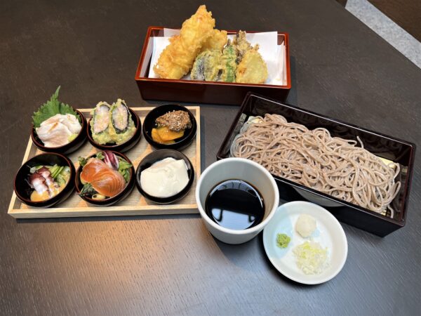 人気メニューは、ランチタイムの時間帯に提供される「季節薫る信州前菜六種とかしわ天そば」。
