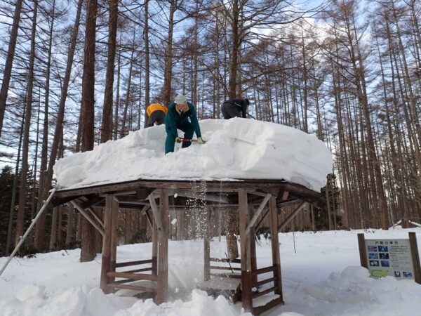 先日、毎年恒例の戸隠森林植物園の雪下ろし作業を林務課職員で行いました![]()