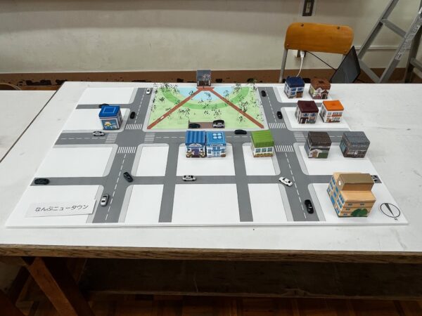 紙で立体の建物を作って模型にし、みんなの「なんぶニュータウン」が完成!
