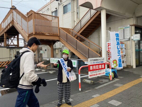 少年補導委員、長野地域振興局の計5名が参加。高校生や通勤中の方々に向けて、