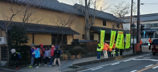 小布施町『人波作戦街頭指導』-5度と冷え込む中、町職員、交通安全協会、育成会、自治会の方々は、道行く人や車に安全を呼び掛けていました。また、巡回車でマイクを通じて安全を呼びかけました。