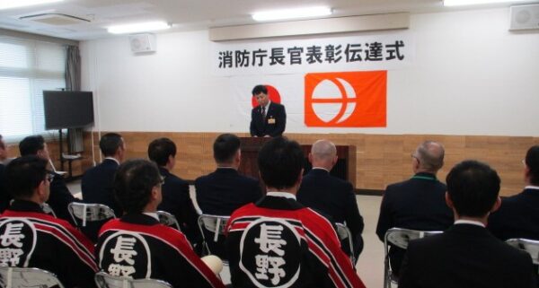 長野地域管内では、20名の方々が「永年勤続功労章」を受賞されました。 また、団体では、竿頭綬を長野市消防局・小川村消防団が受賞されました。