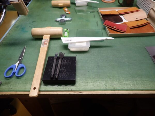 今回の研修では、職人さんにお話を伺いながらシカ革の名刺入れ作りに挑戦しました!