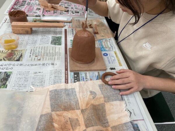 講師には松代陶苑の先生をお迎えし、「タタラ成形 (粘土板(タタラ)を型に押し当てて成形する) 」という技法を用いた器づくりを体験。