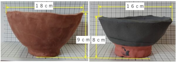 乾燥前の茶碗(18cm × 9cm) 乾燥後釉薬掛けの茶碗(16cm × 8cm)
