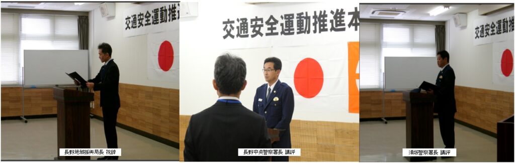 また、長野中央警察署長及び須坂警察署長からは、それぞれ講評をいただき、地域ぐるみで交通事故防止に取り組むことの重要性についてお話がありました。