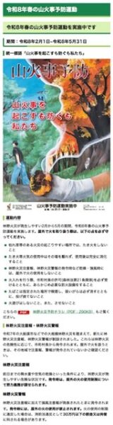 降水量が少なく空気が乾燥し、林野火災が発生しやすい2月から5月の期間、「令和8年春の山火事予防運動」を実施しています。