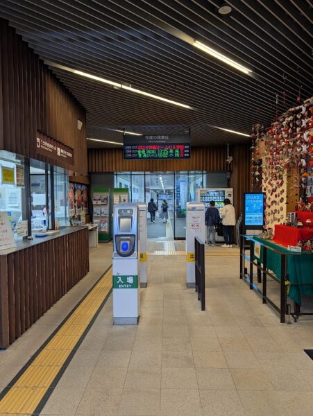 小淵沢駅。出発時刻まで、改札と同じ2階にある待合室と交流スペースで過ごす。