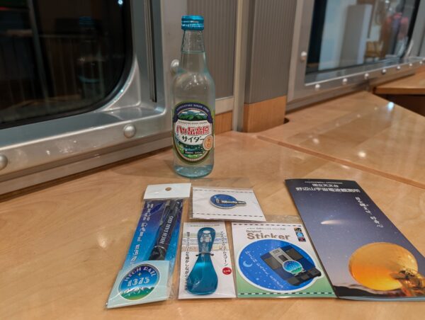 サイダーとお土産を購入。右端のリーフレットは乗車時に星空案内人の方からいただいたもの。